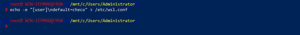 echo -e "[user]\ndefault=checo" > /etc/wsl.conf